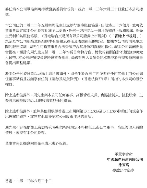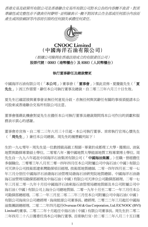 6月30日,中國海洋石油宣布,夏慶龍因工作需要,辭任公司執(zhí)行董事及總裁,自今日生效。公司執(zhí)行董事、首席執(zhí)行官周心懷兼任公司總裁。