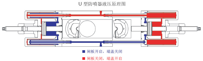 U型防噴器設計為液壓開啟和關閉閘板,并能夠方便快捷地更換閘板。 控制系統所提供的關閉壓力用于關閉防噴器閘板,同時也可以用于開啟端蓋。用于開啟端蓋時,控制系統的關閉壓力使閘板關閉,拆除端蓋螺栓后,利用控制系統的壓力開啟端蓋。在端蓋完全開啟后,閘板就可以從本體中取出。在每塊閘板的頂部均有用于安裝吊扣的螺紋,可以裝上吊扣,以便閘板吊出。 控制系統所提供的開啟壓力用于開啟防噴器閘板,同時也可以用于關閉端蓋。用于關閉端蓋時,控制系統的開啟壓力使閘板開啟。在閘板更換后,利用控制系統的開啟壓力關閉端蓋。在閘板移進防噴器前,閘板先被拉出靠近端蓋。這就保證了閘板不阻擋防噴器的垂直通孔,避免和井內鉆桿摩擦。在端蓋完全關閉后,安裝端蓋螺栓緊固。